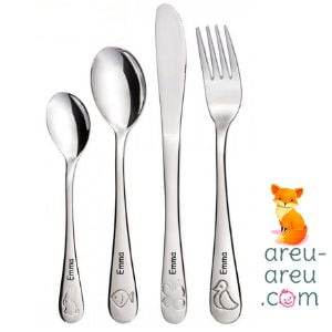 Pour l’heure du repas, nous proposons une gamme de couverts enfants et bavoirs personnalisables avec leur prénom.